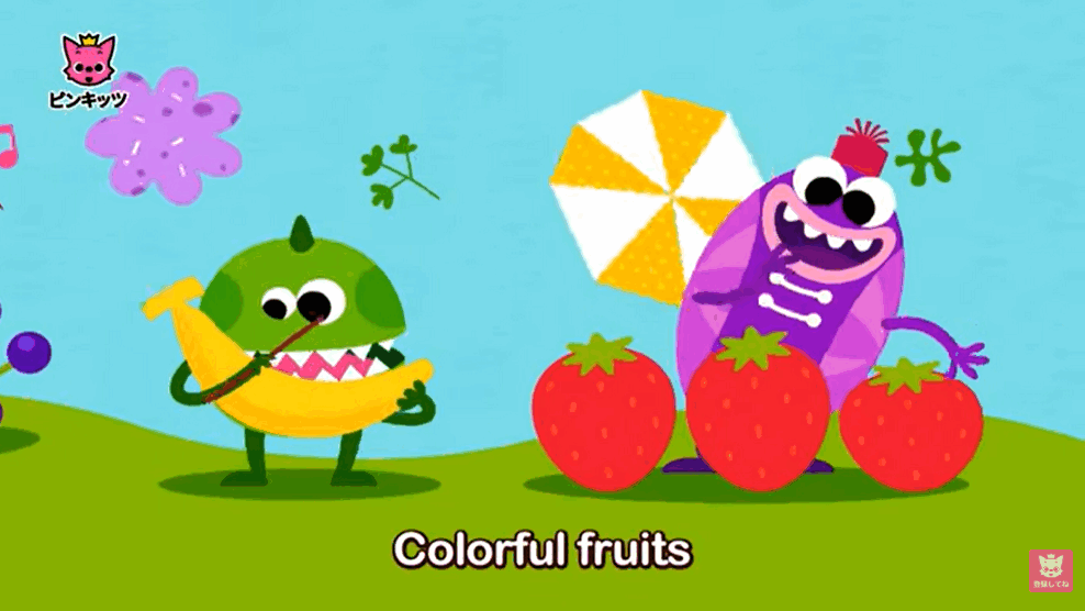 かわいいフルーツが特徴の英語動画、正直大人が見ても楽しいし出てくるキャラクターがめっちゃかわいい。1歳から見せてもお母さんも楽しめる動画です。