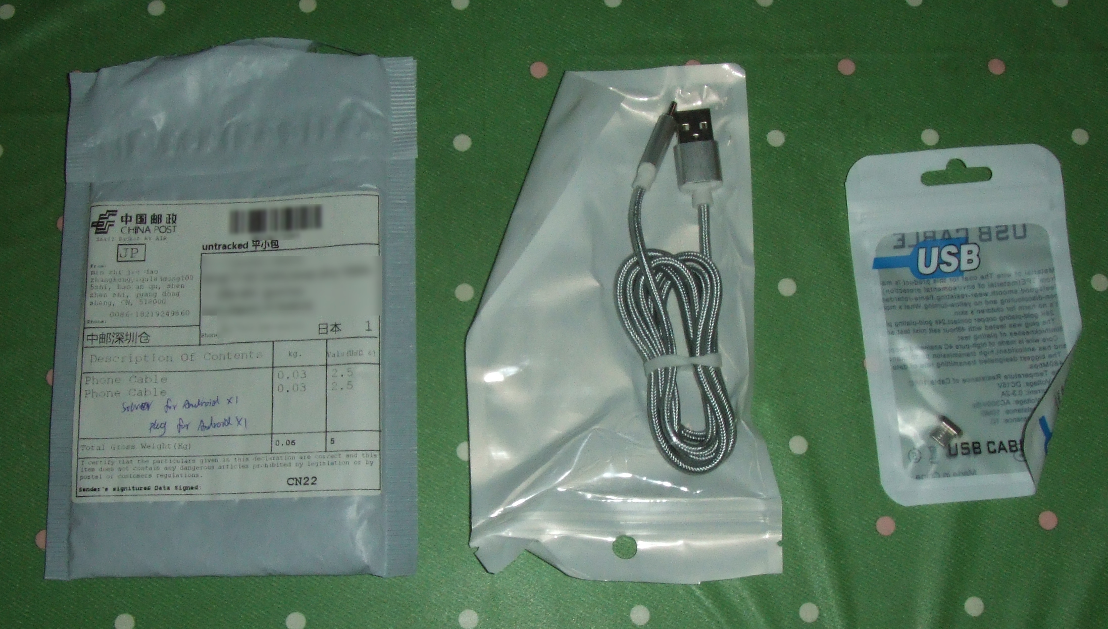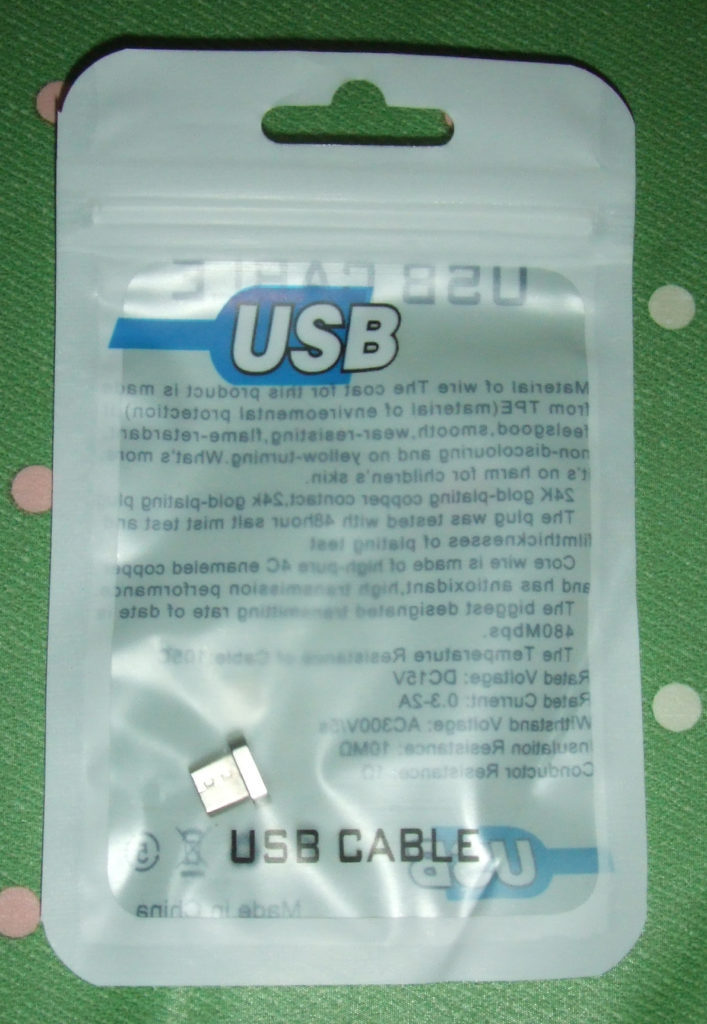 一番左が入ってきた袋、中央がUSBケーブルと端子、そして右が端子のみ