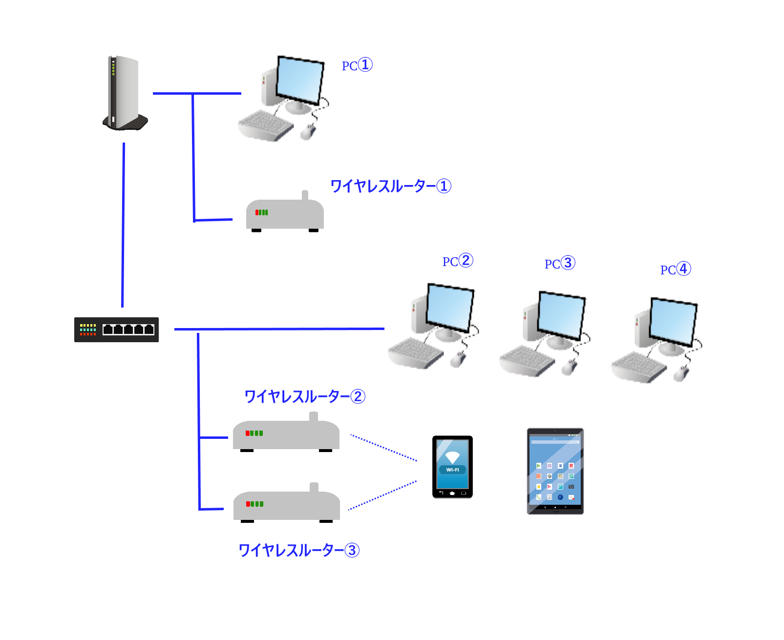 こんな感じですかね。ワイヤレスルーター①とワイヤレスルーター③はタブレットやスマホをその部屋で使えるようにするため個別に設定してある。