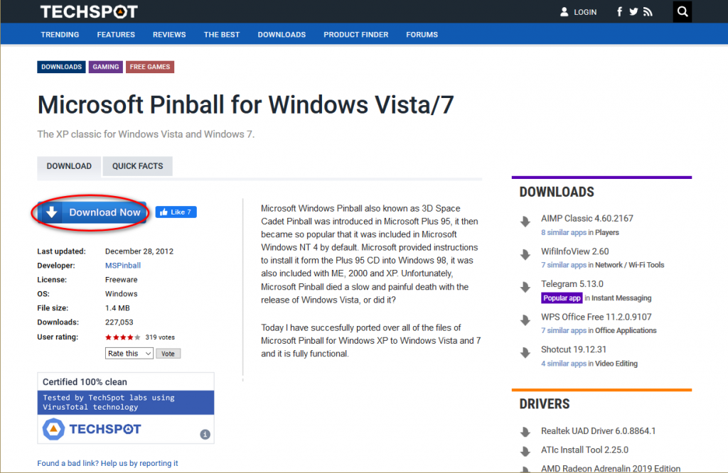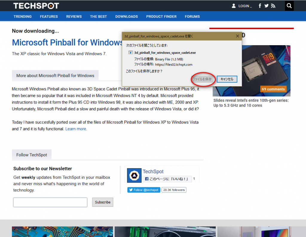 「Windows 3D ピンボール Space Cadet」 のダウンロード