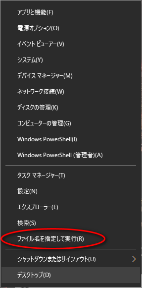 「Windows」キーと「R」キーを押すか、スタートメニューアイコンの上で右クリックをして「ファイル名を指定して実行」をクリックする。