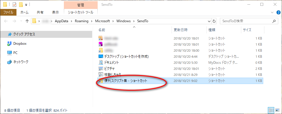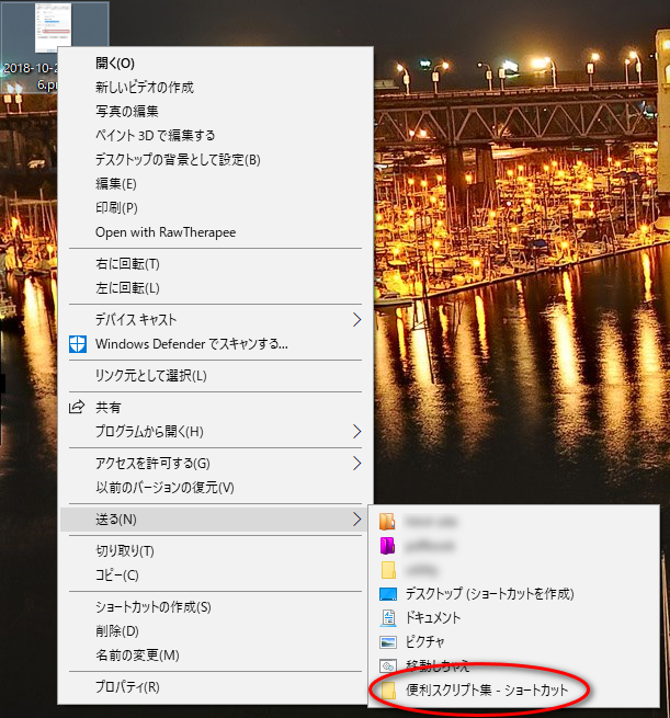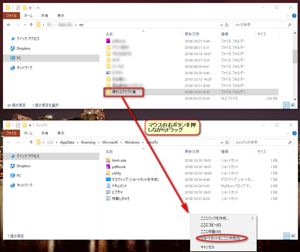 今回は「便利スクリプト集」を例にします。そして、「送る(N)」フォルダへマウスの右ボタンを押しながらドラッグ&ドロップします。