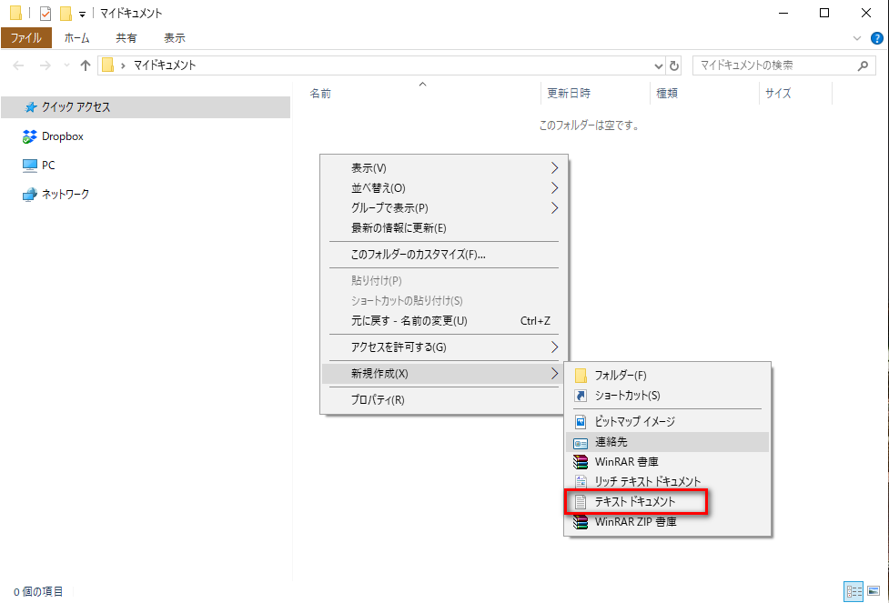 ここで右クリックして、「新規作成」から「テキストドキュメント」を作成します。