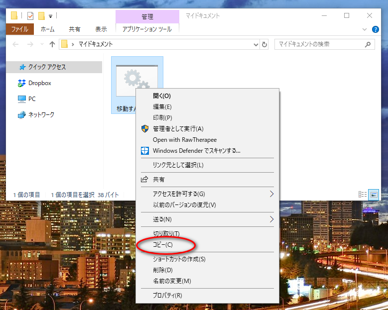まず、「移動すんべえ.bat」上でマウスを右クリックして「コピー」をクリック