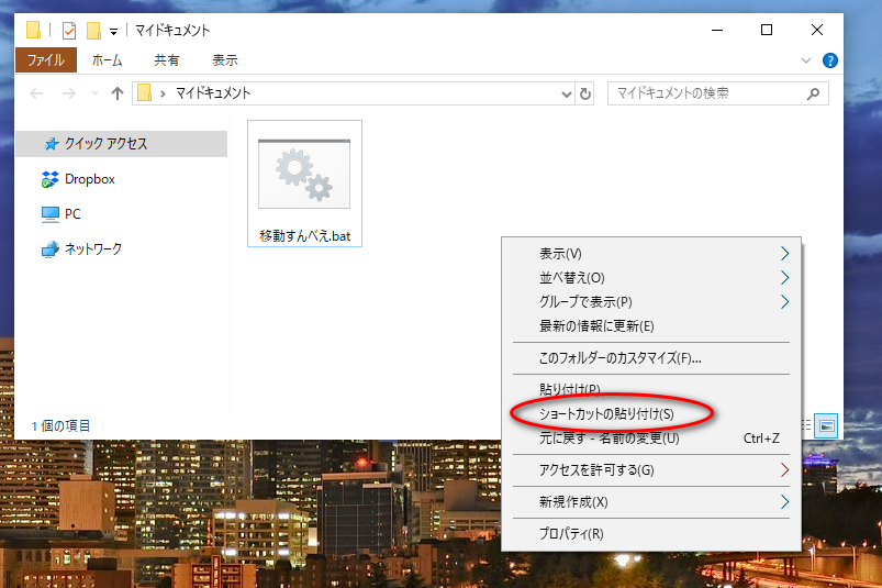 そうしたら、その「マイドキュメント」フォルダ内の「移動すんべえ.bat」ファイルの無いところで右クリックします。そのメニューの中の「ショートカットの貼り付け(S)」をクリックする。