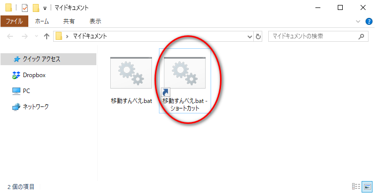 さてBATファイルができたところで、このbatファイルのショートカットファイルを作っておきましょう。