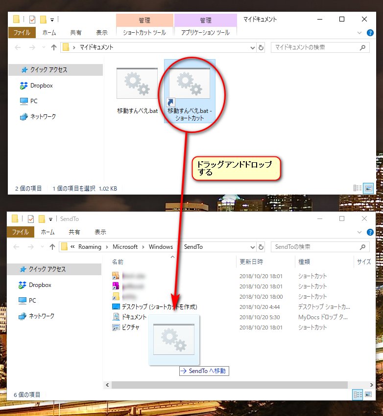 そうしたらドラッグ&ドロップでショートカットファイルを「送る(N)」フォルダへ移動させます。もしコピーモードになってしまったら、「Shift」キーを押しながらドラッグ&ドロップします。