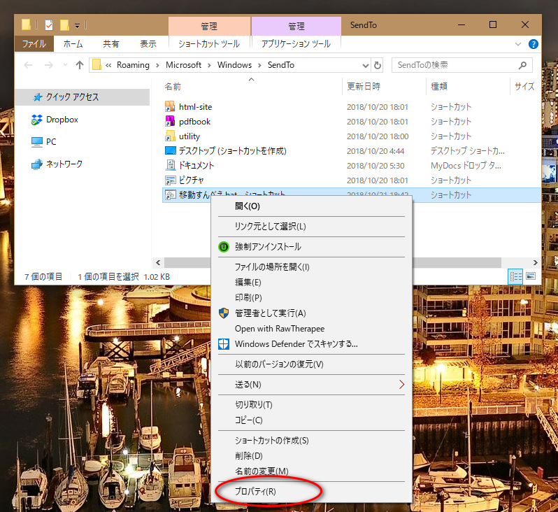 「移動すんべえ.batのショートカット」上で右クリックする。そのメニューの最下層に「プロパティ(R)」があるので「プロパティ(R)」をクリックする。