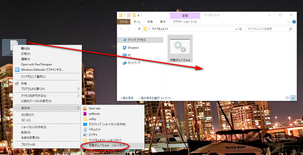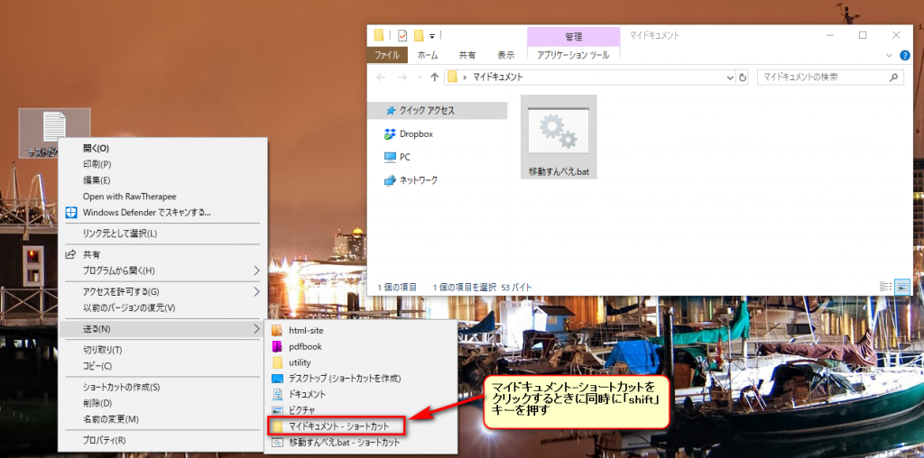 このファイル上で右クリックし「送る(N)」から「移動すんべえ-ショートカット」をクリックする。