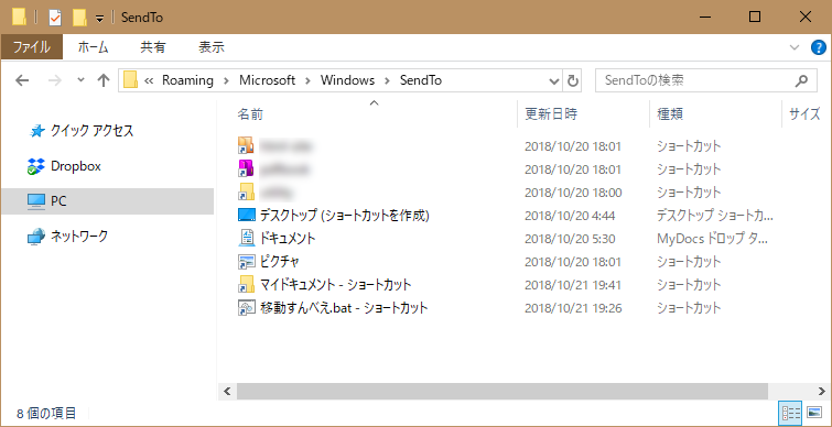 エクスプローラーが開いて、先ほどの「送る(N)」のフォルダが表示されているはずです。すでに私のフォルダは編集してしまっているためデフォルトではありません。
