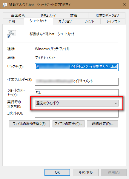 この現象を回避するため、このショートカットのプロパティをいじる。