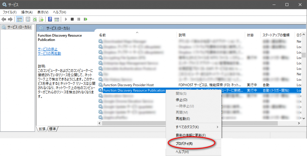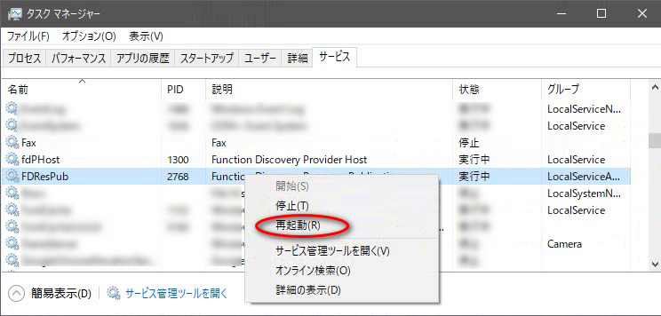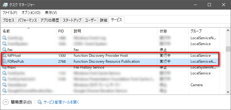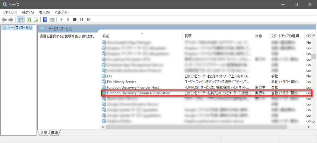 今回の場合、Function Discovery Resource Publicationの誤作動が原因としてあるため暫定的にこのような手段をとりました。