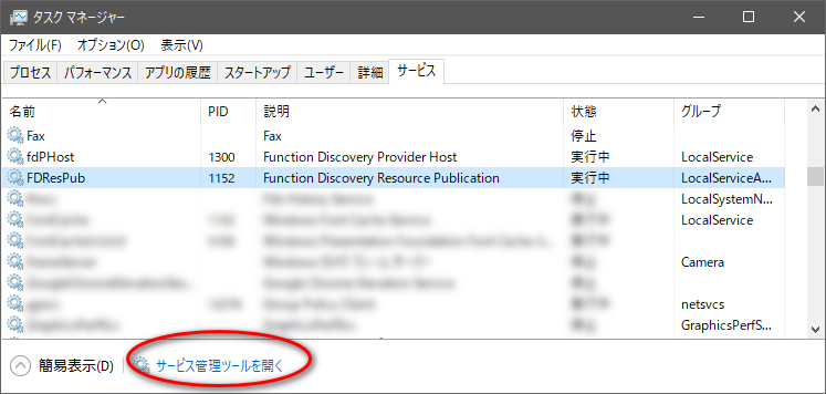 - タスクマネージャからサービスタブを選択し、