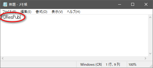 メモ帳にもどり先ほどコピーした、「FDResPub」を右クリックから貼り付けをする。こんな感じになっていればOK