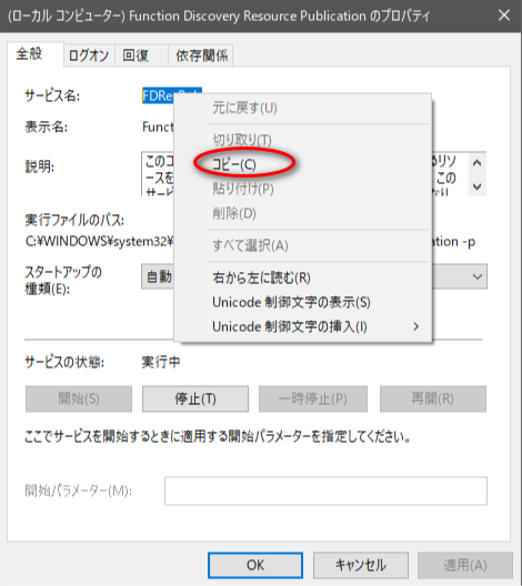 ダイアログが出てきたら、サービス名上で右クリックして「コピー」をクリックする。(反転文字になっていると思いますがなっていなかったたドラッグしてっから右クリックしてコピー)これでサービス名がクリップボードにコピーされました。