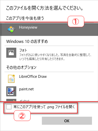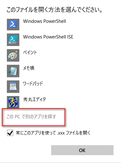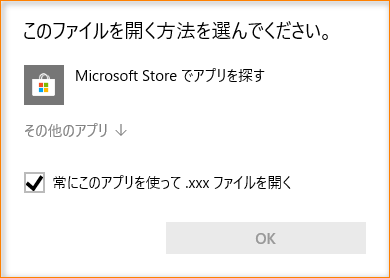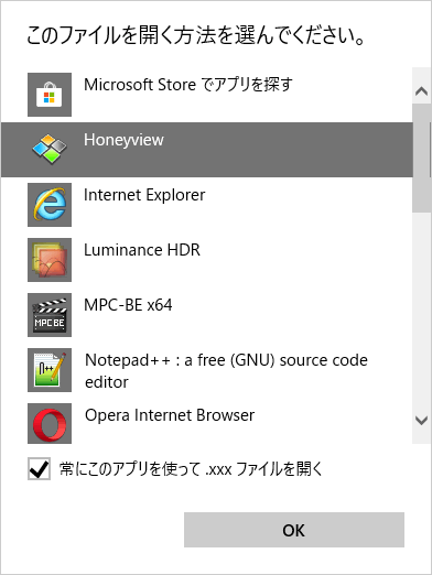 このとき「常にこのアプリを使って.xxxファイルを開く」にチェックを入れておくと、この種類の拡張子で通常使うアプリが固定される。