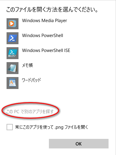 その中に起動できるアプリが登録されていればそれを選択。もしなければ、一番下までスクロールバーをさげると、「このPCで別のアプリを探す」が出てくるのでそれをクリック。