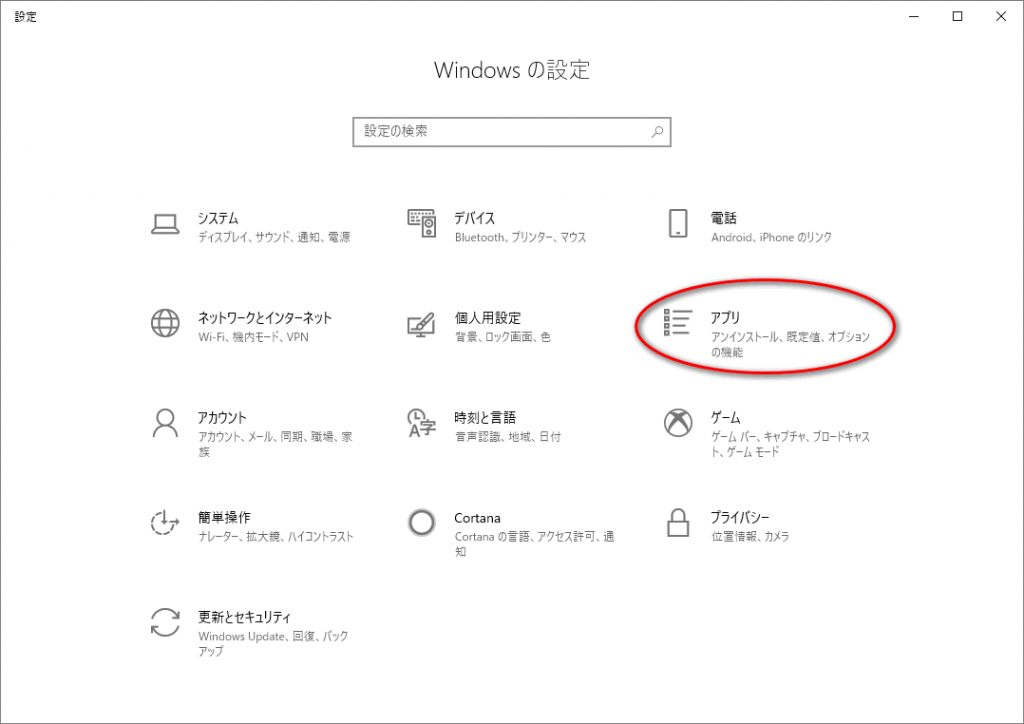 その場合、「Windowsの設定」を呼び出します。そこからアプリをクリック。