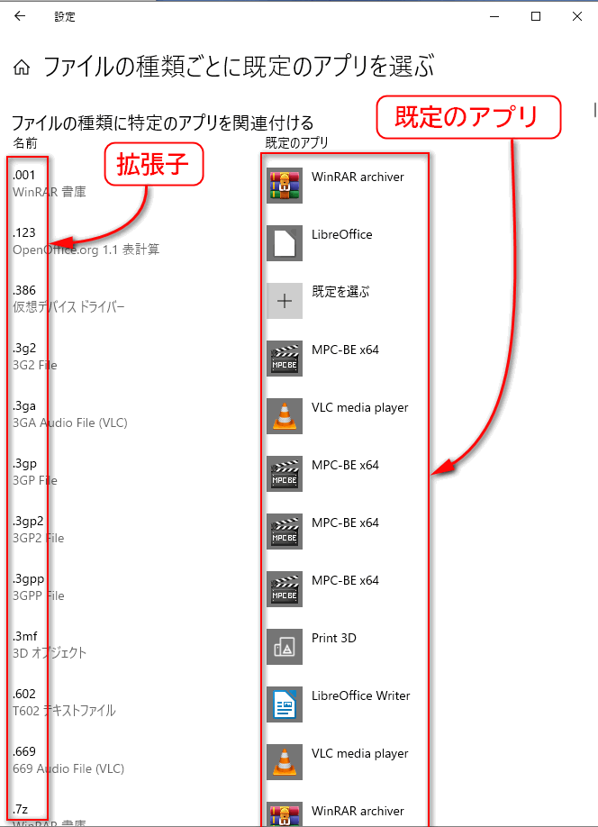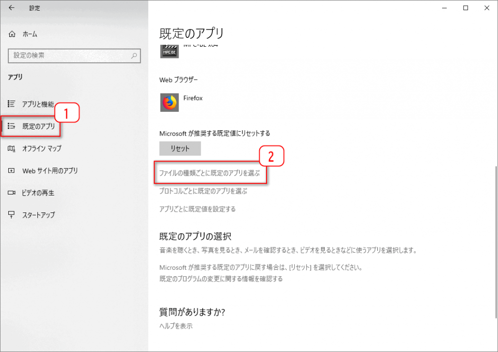 左ペインの「既定のアプリ」をクリックすると右ペインの中断あたりに「ファイルの種類ごとに規定アプリを選ぶ」をクリックする。