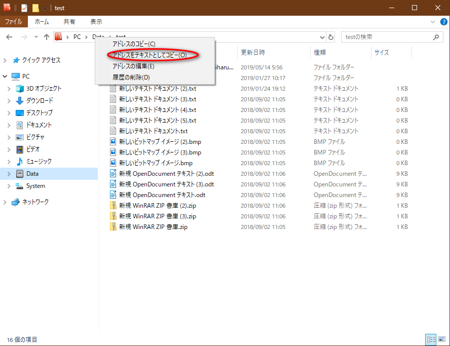 するとメニューが表示されるので「アドレスをテキストとしてコピー(O)」をクリックしてクリップボードにフォルダまでの構成をコピーしておく