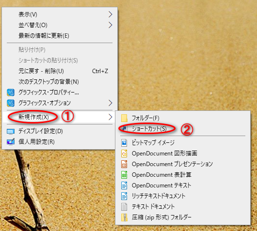 まずデスクトップ上から右クリックで新規作成からショートカットを選ぶとウィザードが起動するので、テキストボックスに