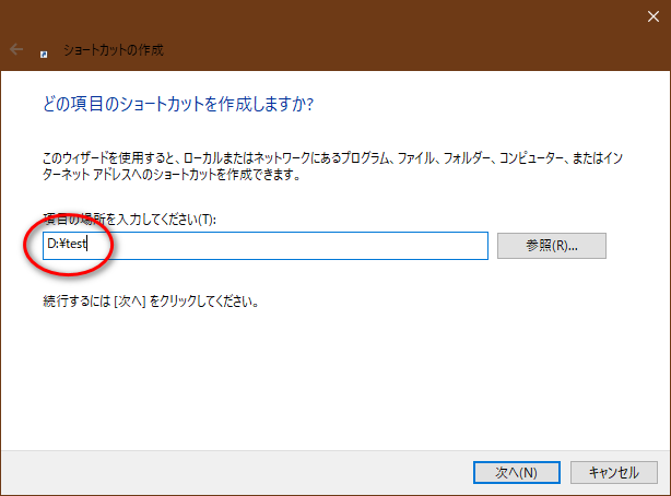 今回は「D:\test」がフォルダ構成なためこれが入力される。
