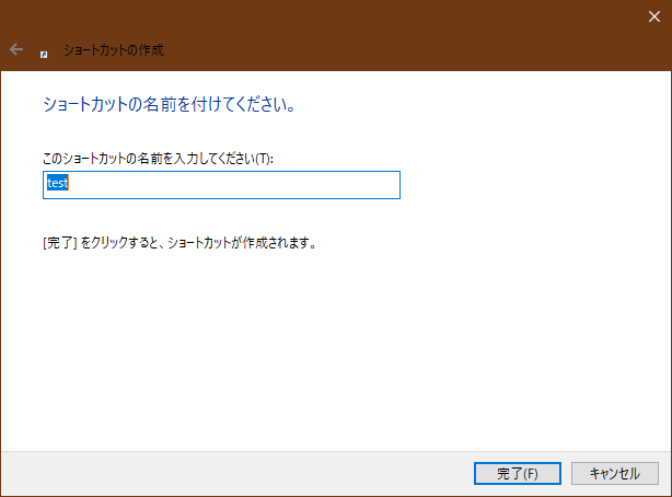 「次へ」ボタンを押す。するとショートカット名を聞いてくるので適当な名称を入れてもいいし、そのままでもOk。