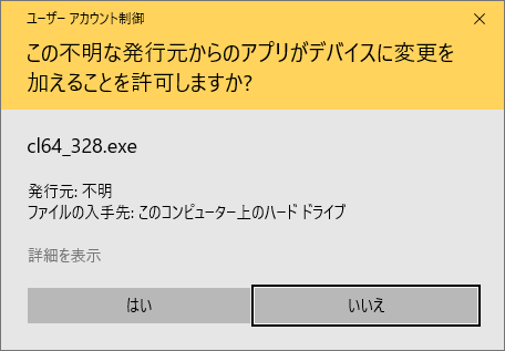 ダウンロードしたファイルを実行してインストールします。ユーザーアカウント認証画面がでたら「OK」ボタンを押して進めます。