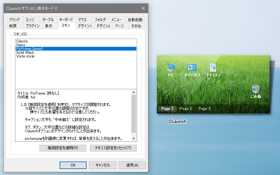 ダウンロードしたスキンが表示されているはず。今回は「PicFrame_[none].zip」というものをダウンロードしました。