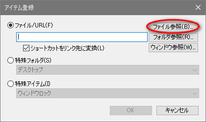すると「アイテム登録」ダイアログが表示されるので「ファイル参照(B)」をクリックします。