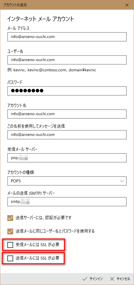 今回は、POP3ということで「受信メールにはsslが必要」と「送信メールにはsslが必要」はチェックを外しています。